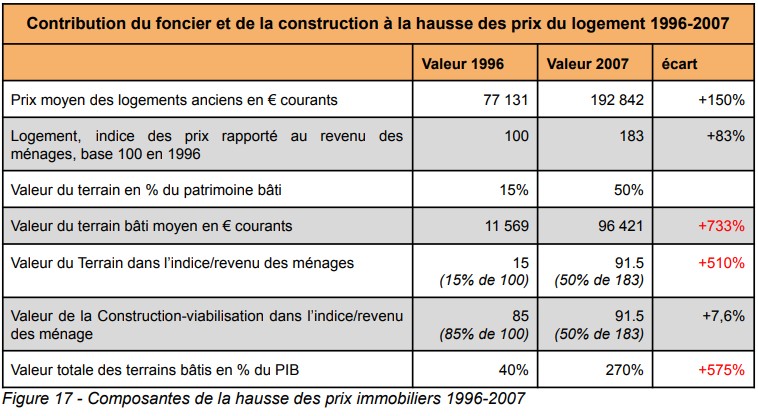 Entre 1998 et 2008, le prix médian du logement en France est passé de 2,4 fois à 4,2 fois le revenu médian des ménages et la part du foncier dans le prix du logement est passée de 15% à 45-50%. Durant cette période, le prix du foncier rapporté au revenu des ménages a été multiplié par 6 ! (cf. figures ci-dessous)